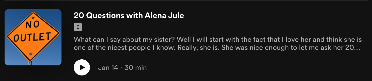 What can I say about my sister? Well I will start with the fact that I love her and think she is one of the nicest people I know. Really, she is. She was nice enough to let me ask her 20 stupid questions even if she did not always give an actual answer. We talked about so many things and had a few good laughs...actual fun! Topics include Why god hates us, penguins, pizza, tv shows and we finally set the record straight on a 25 year myth. All in under 30 minutes!